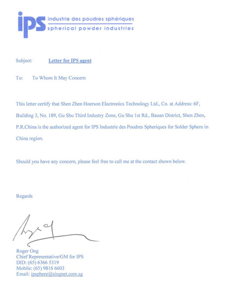 深圳市漢爾信電子科技有限公司拿到了法國ips公司bga錫球的中國代理資格